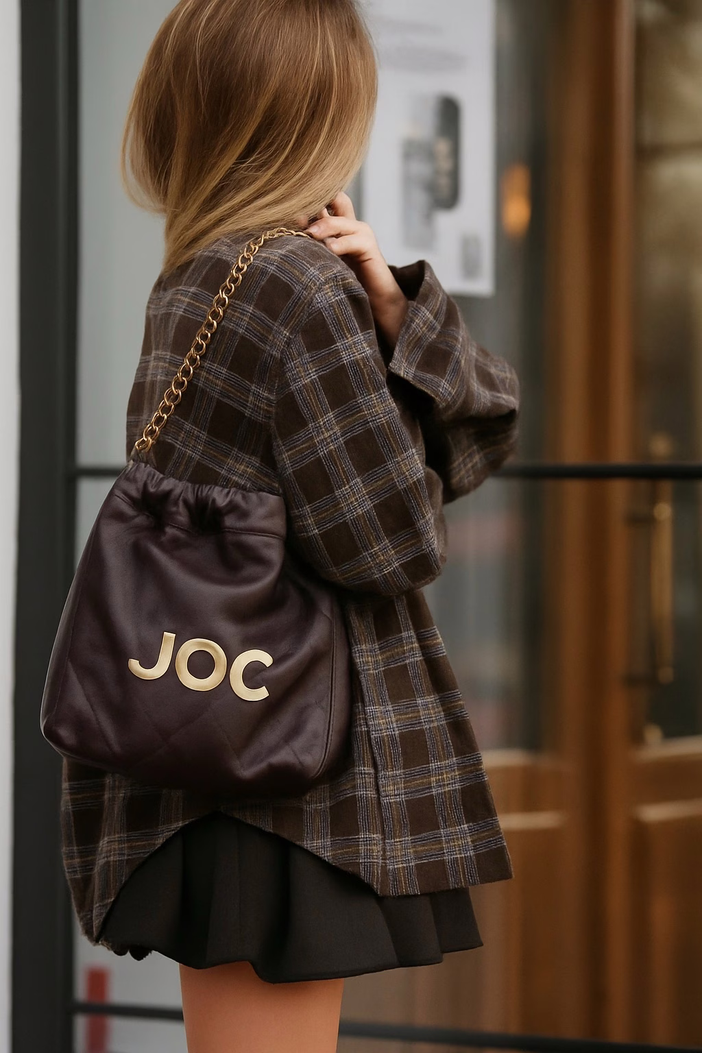柔软却挺括的深棕皮革,搭配象征 JOC 科技資本ᴬⁱ 标志性的 金属字 Logo,以经典金链肩带收尾,使整体呈现高净值女性特有的 都会力量感与简洁优雅。